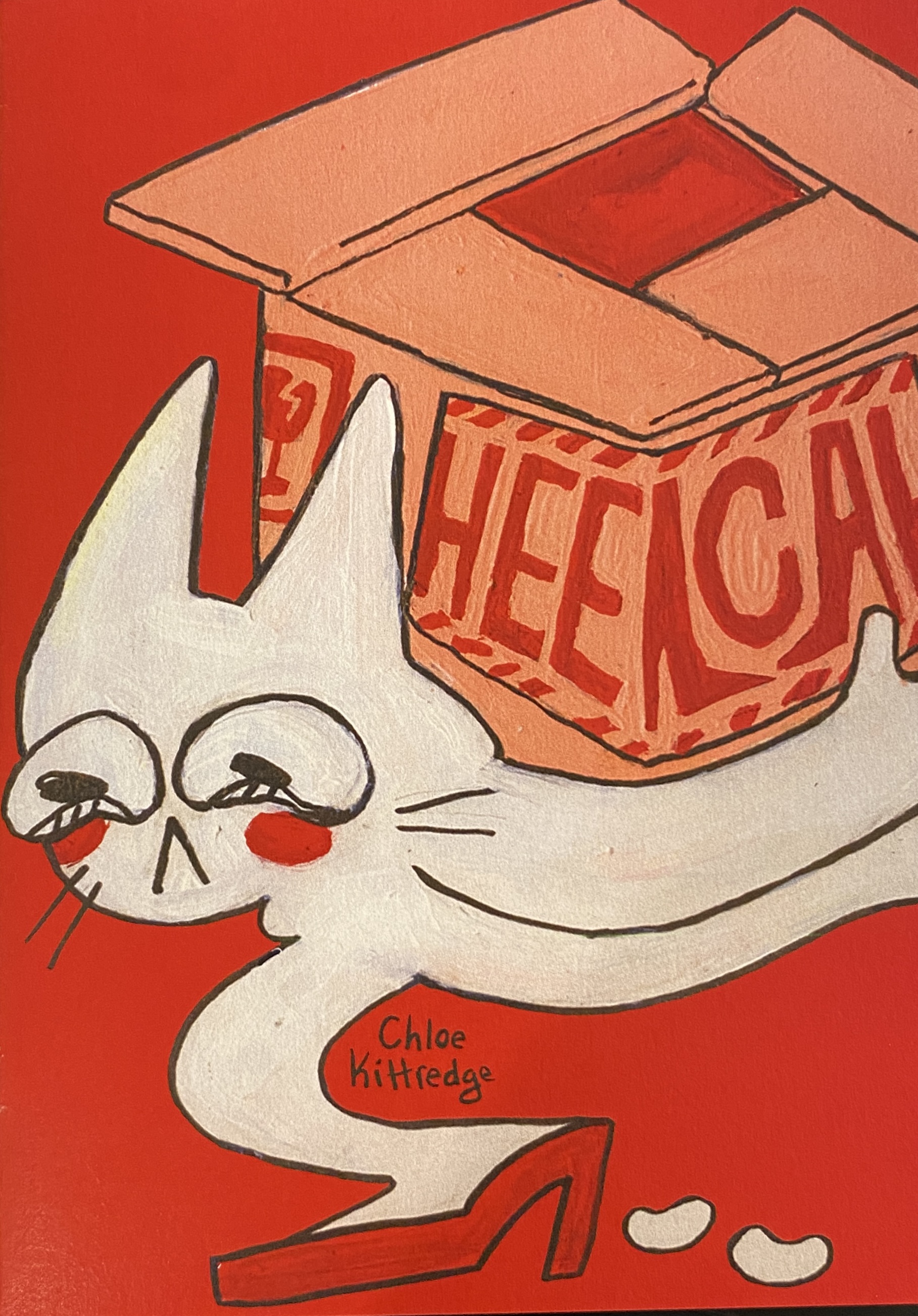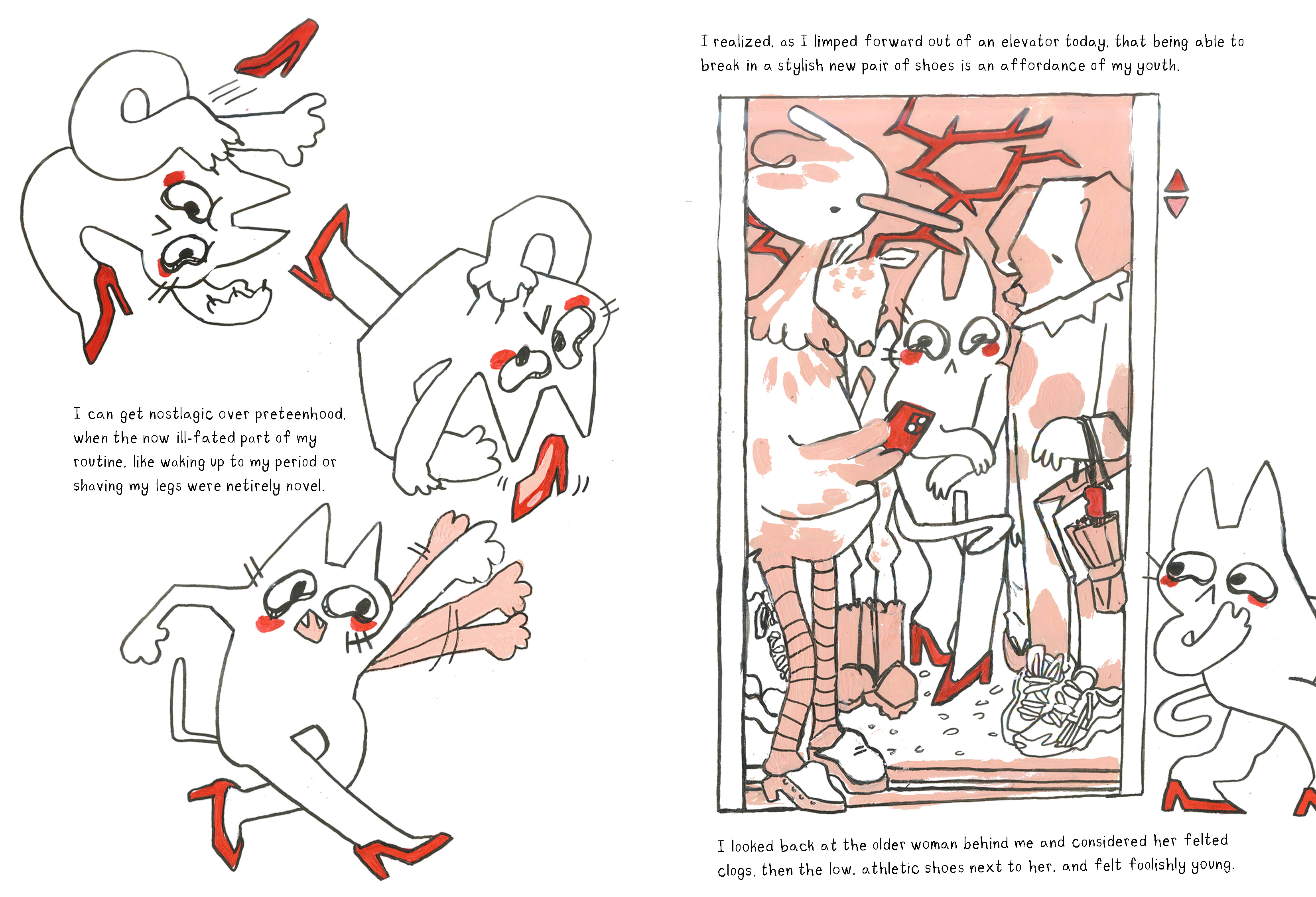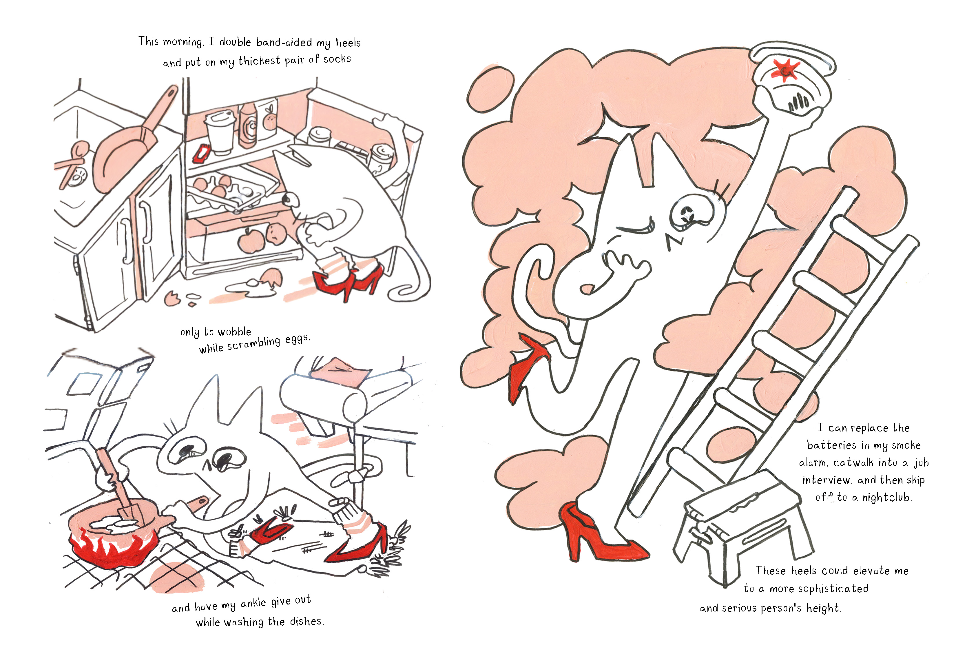 (2023-2024), acrylic, ink, Photoshop“Heelcat” is a 12 page illustrated short story about the strife of coming to age as told from the perspective of a cat in high heels.